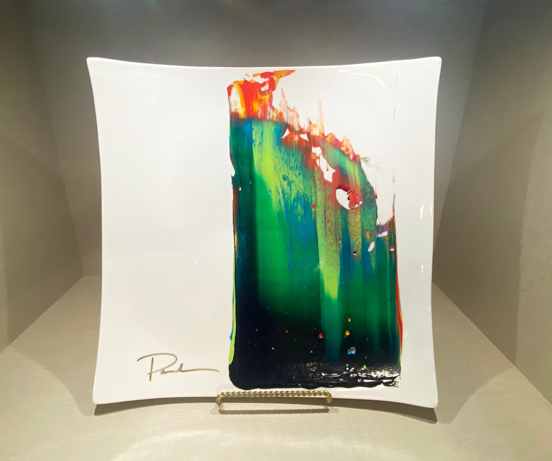 "tranZformation ll" was one of my first paintings. I had heard a voice whisper in my right ear that said "go buy plates and paint on them". So I did. I set up a room in my basement as a studio and began painting. When "tranZformation ll" appeared in one stroke, I was amazed at the configuration of color! I remember running into the family room to show Scott what I had just created.